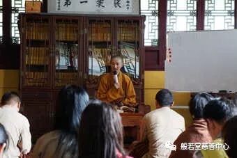 玉苍山法云寺住持上心下智法师在藏经楼为志工们开示“妙法莲华经”。