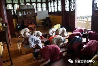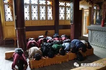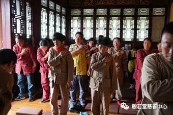 志工们在法云寺藏经楼由法师带领下虔诚礼佛。